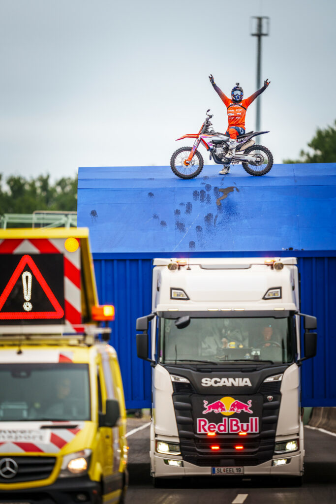 Ein 40 Meter Sprung von Truck zu Truck, ausgeführt mit einem Tsunami Backflip in der Luft, bei einer Absprunggeschwindigkeit von 74 km/h.